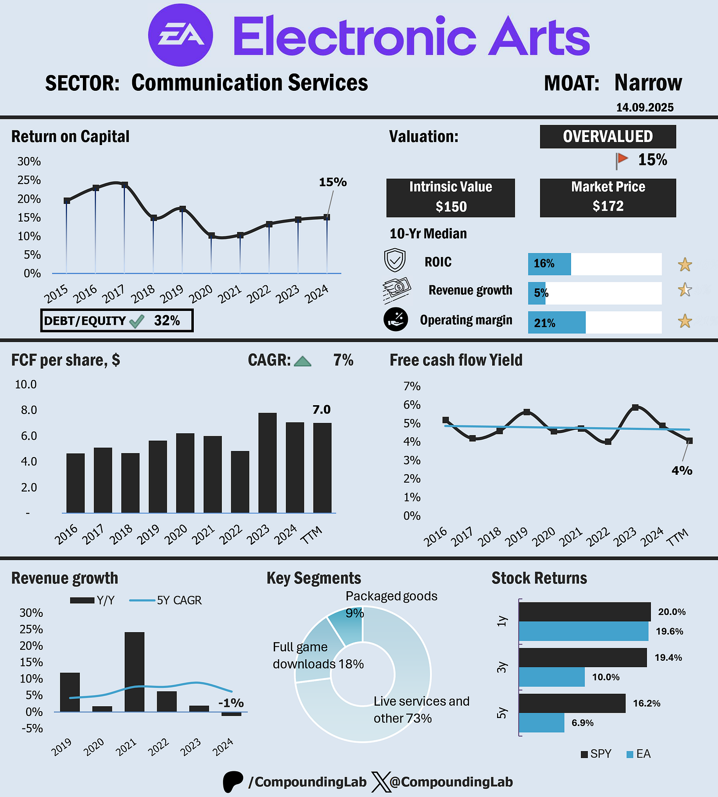 Here’s the thing though: fundamentals don’t lie. EA has posted a 10-year median ROIC of 16%. That’s solid, and it screams “narrow moat” — they’ve got franchises (FIFA/EA Sports FC, Madden, The Sims) that keep players locked in year after year. On leverage, the debt-to-equity ratio sits at ~32%, comfortably manageable. Nothing to worry about there.